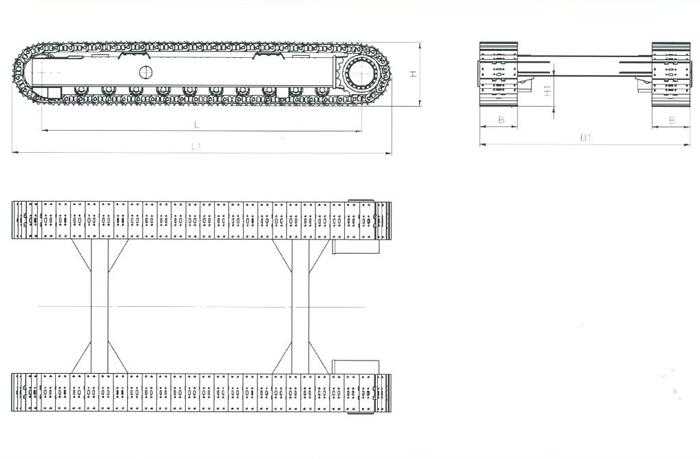 中心距L | 底盤總長L1 | 履帶板寬B | 底盤外寬B1 | 底盤高度H | 離地高度H1 | 單速 | 雙速 | ||