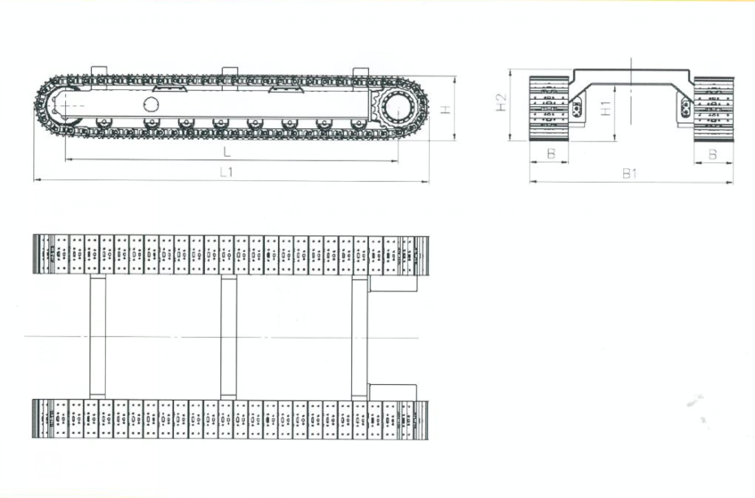 中心距L | 底盤總長(zhǎng)L1 | 履帶板寬B | 底盤外寬B1 | 底盤高度H | 離地高度H1 | 單速 | 雙速 | ||
