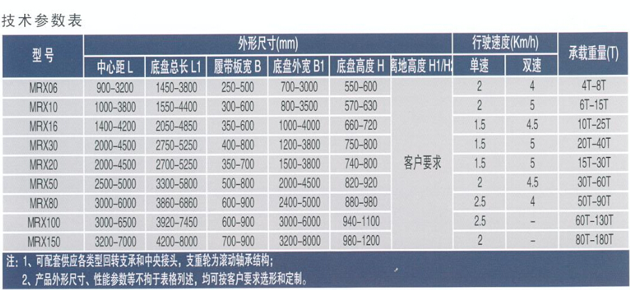 15噸帶回轉(zhuǎn)支撐的履帶的底盤(pán)性能參數(shù):承載總重:15噸,工作壓力:16MPA,行駛速度1-2公里每小時(shí),接地比壓:0.089,爬坡度數(shù):20度。制動(dòng)形式:機(jī)械制動(dòng)加液壓鎖制動(dòng)?;剞D(zhuǎn)接頭:定配。
